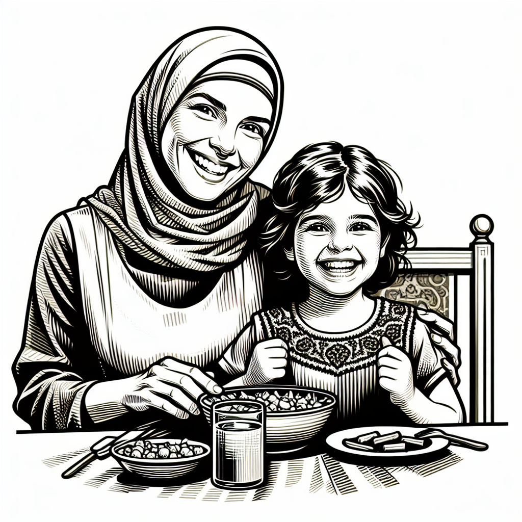 אם ובת מחייכות עד שולחנו איקון.